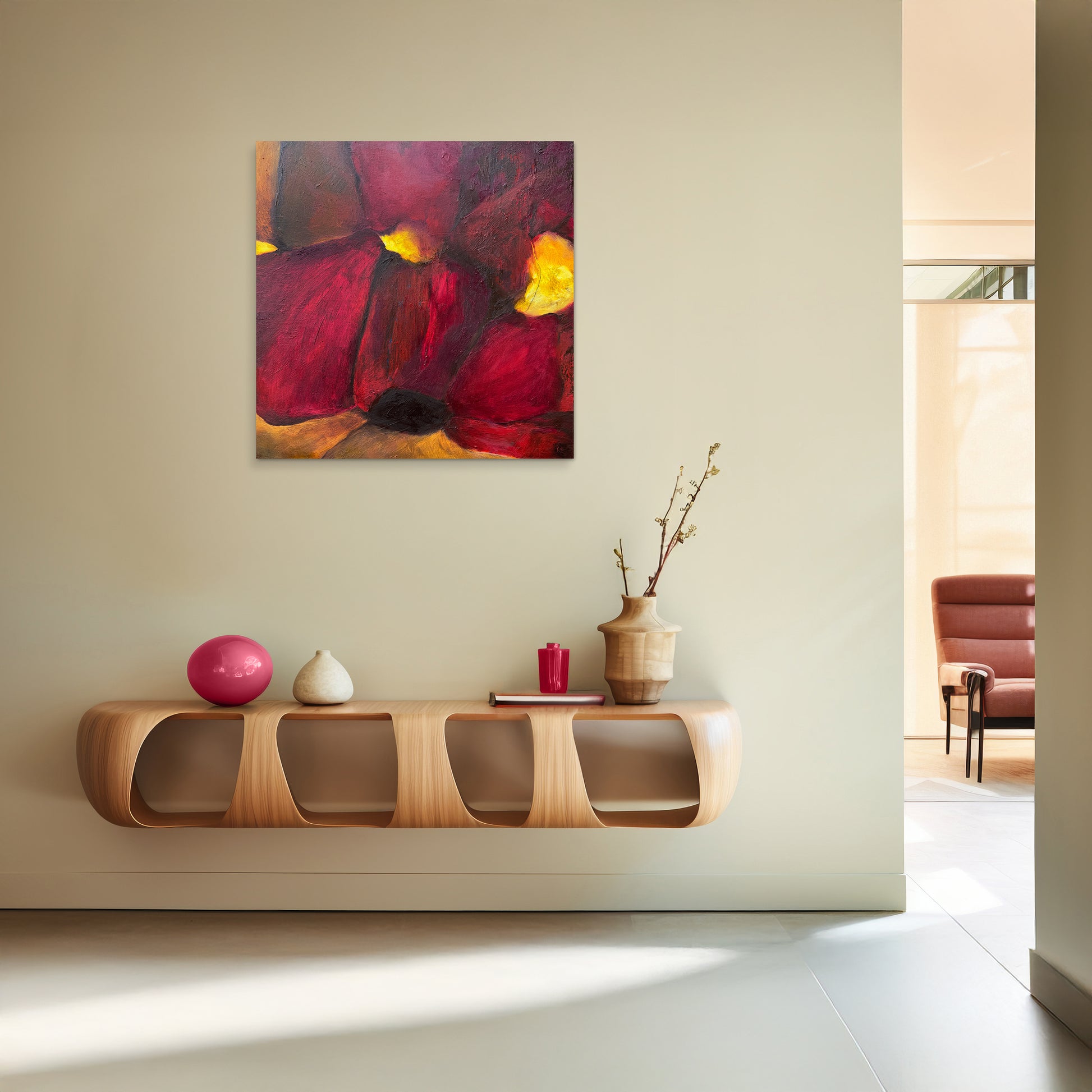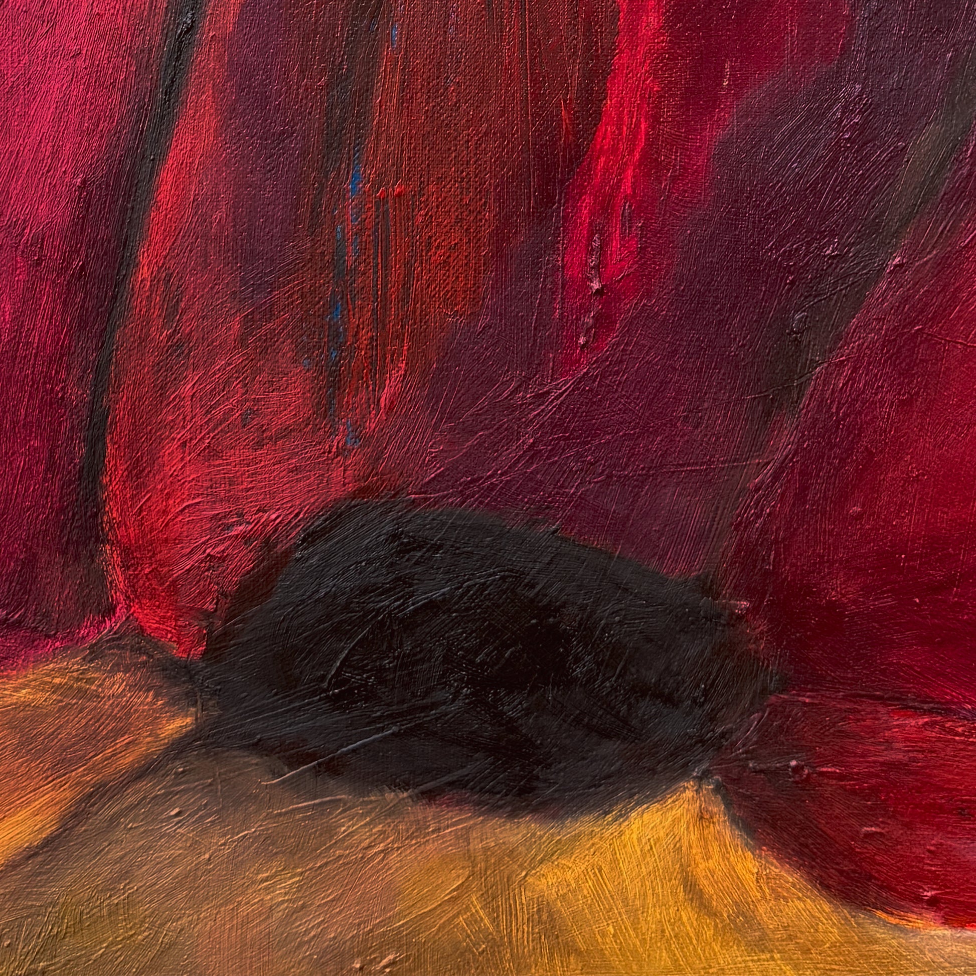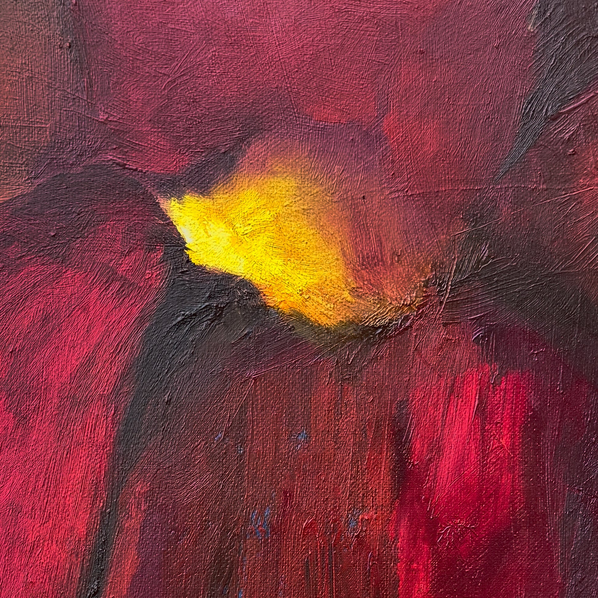Scarlet Eve is an abstraction of the Sea Hibiscus: a flower that moves through yellow to deep red as the day passes: bright in the morning, burning in the afternoon, and settling into deeper tones by dusk. This painting captures that shift, when colour has deepened, softened, and settled fully into itself.
